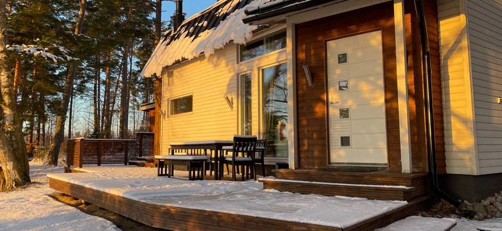Ulkotilat: Iso terassi missä on ruokailuryhmä, sohvaryhmä ja kaasugrilli. Puuliiteri (polttopuut kuuluu vuokraan).